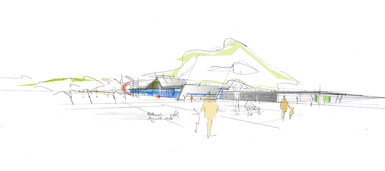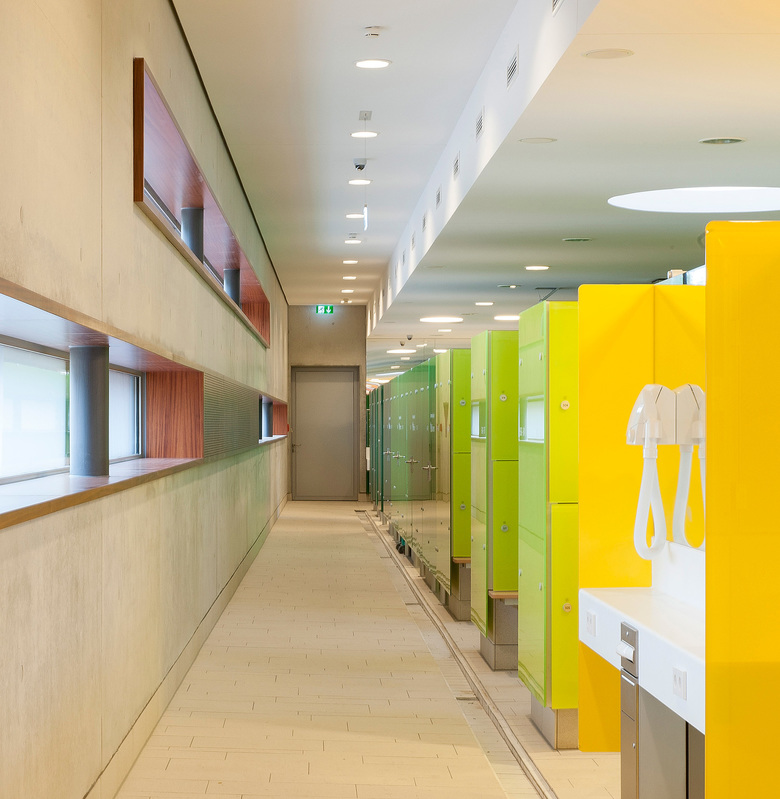 Visitors enter the baths through the building’s main entrance at the centre of the “kink” in the ground plan, from where they have a direct view into the water world. They are guided from here through a large changing area and into the bathing area. Various folds in the roofs give rise to apertures that serve to illuminate the indoor bathing area evenly.