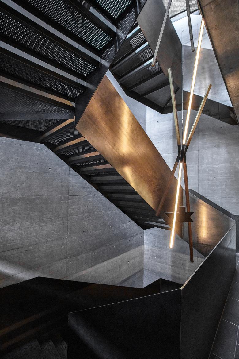 Die Fassade aus schmalen hochformatigen Chromstahlblechen mit unterschiedlichen Prägungen und Lochungen verschafft ein spannungsvolles Spiel zwischen Aussen- und Innenraum und verleiht dem Gebäude eine dem Metallhandwerk getreue Identität.