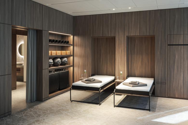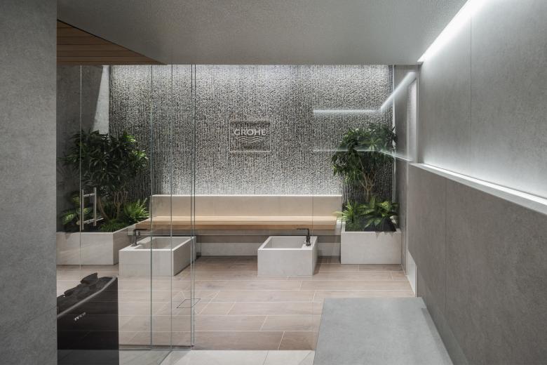 The concept was developed in close collaboration with the inhouse LIXIL Global Design and Brand Identity Team. The high-quality sauna, spa, and fitness areas feature a straightforward, elegant design language characterized by aesthetic contrasts. Warm woods and cooler stone materials, a mix of light and dark surfaces, come together to create a luxuriously designed interior. The well-appointed spacious rooms, user-friendly features, and pleasant textures place well-being at the center of the experience, making the GROHE Water Experience Center a special place for wellness relaxation and product staging.