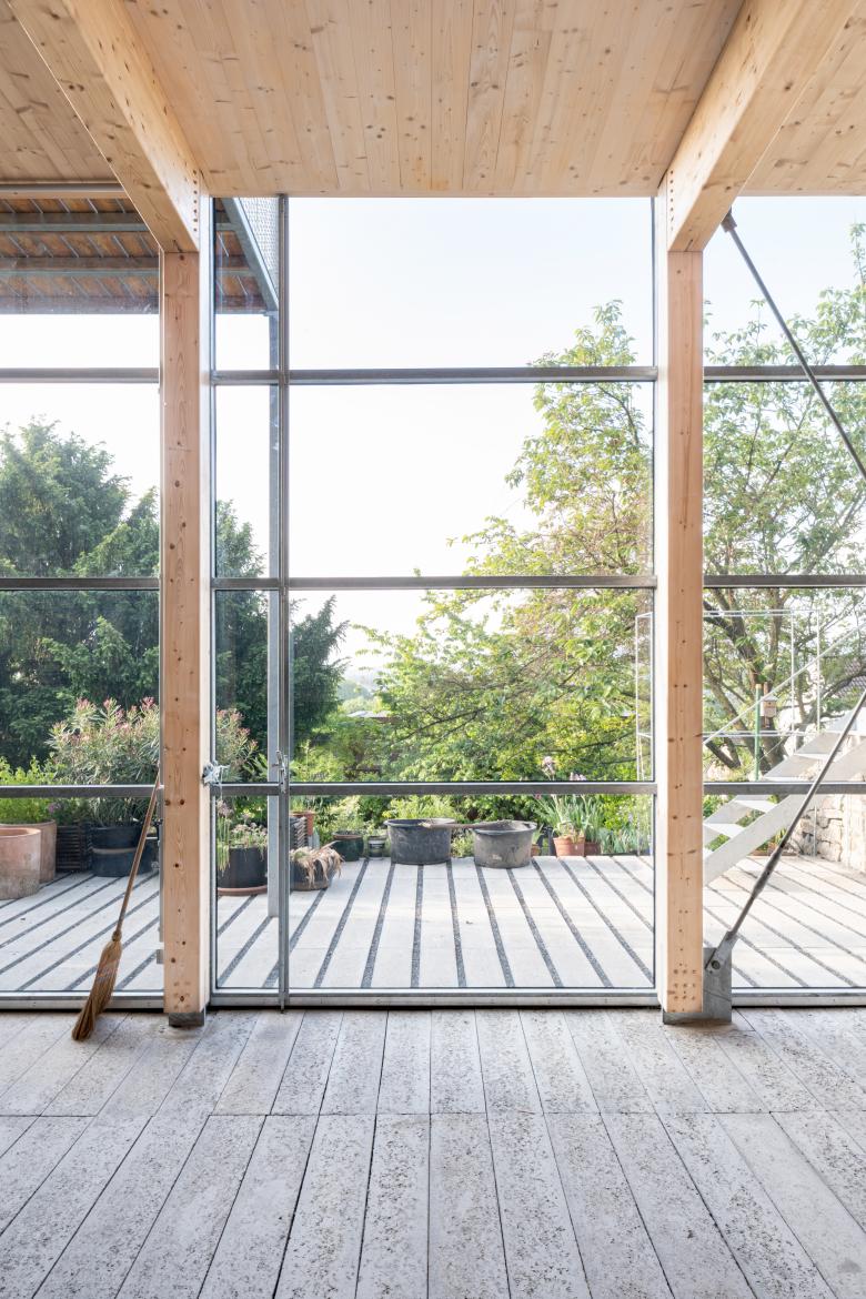 Darunter entsteht ein Raum. Er ist da, fast 4 Meter hoch und er ist kalt – unbeheizt und nicht gedämmt. Ein Gartensaal! Und es zeigt sich, dass gerade dieser "primitive" Raum zum neuen Ort des Lebens wird. Er bildet Herz und Bindeglied zwischen Alt, Neu und Natur.