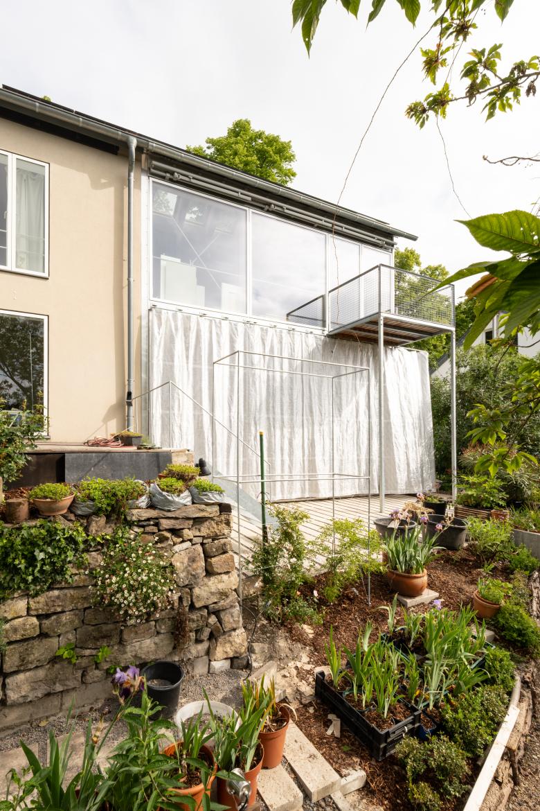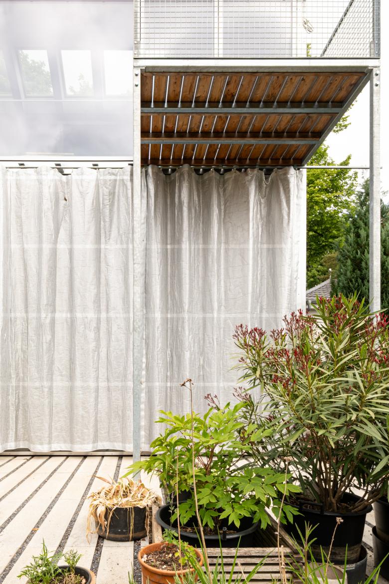 Gebaut wird in Holz. Ein einfaches Skelett von 8x7 Metern hebt die neue Nutzungseinheit ein Geschoss über die Gartenebene. Straßen- und Obergeschosslevel werden zugleich bedient. Der Baukörper ist in ein hinterlüftetes Kleid aus Aluminiumwelle gehüllt. Die bestehende Haustechnik versorgt den Neubau gleich mit. Der Blick aus dem Inneren richtet sich südlich ins Tal der Stadt, das Licht kommt aus Norden.