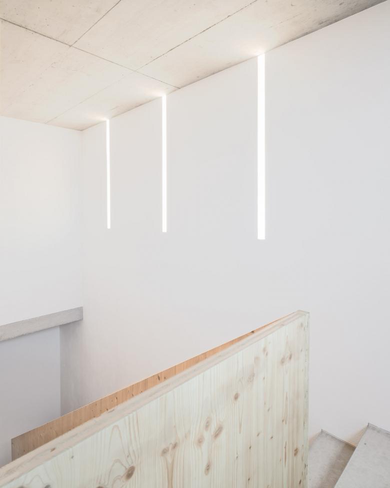 On the west side is the building’s entrance, accentuated by a cut-out in the building volume. Standing in the hall, the occupant’s view is directed through the stairs to the first floor. The two-storey high staircase reaching from the first to the second floor forms the light-flooded heart of the private rooms. It provides access to the bathroom, the masters bedroom and the children’s rooms. The terrace that faces west extends the living room area and enhances its spatial quality.