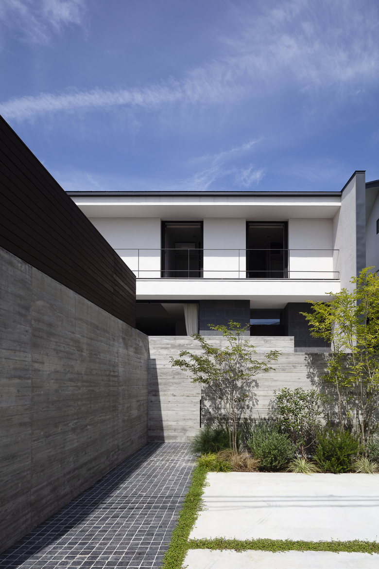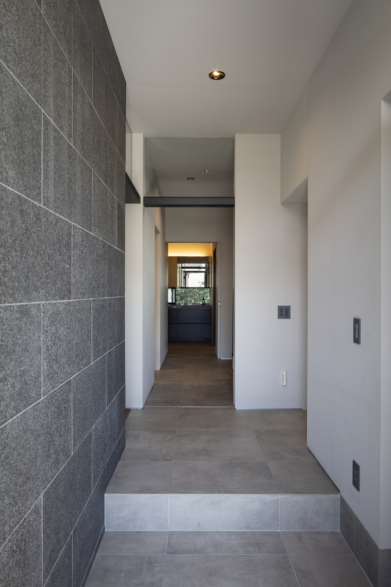The shape of the site was utilized as it was, with a parking lot on the lower level facing the street and the house and garden planned on the upper level at the back. The upper part of the house and the garden are located at the back of the house. Above the parking lot is a terrace that can be enjoyed continuously from the garden.