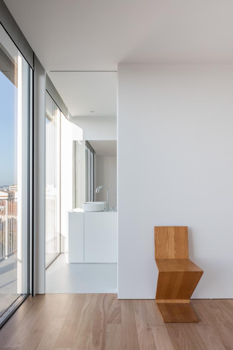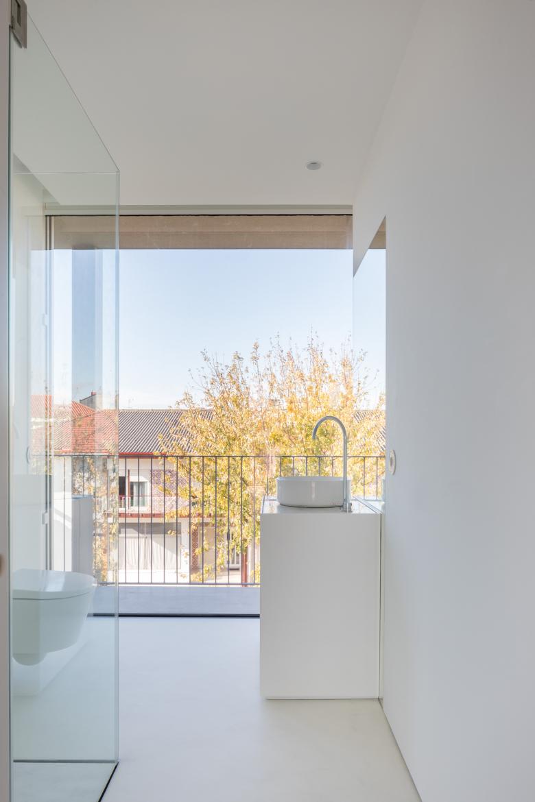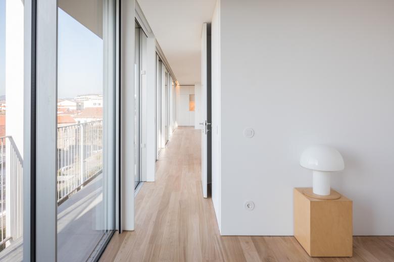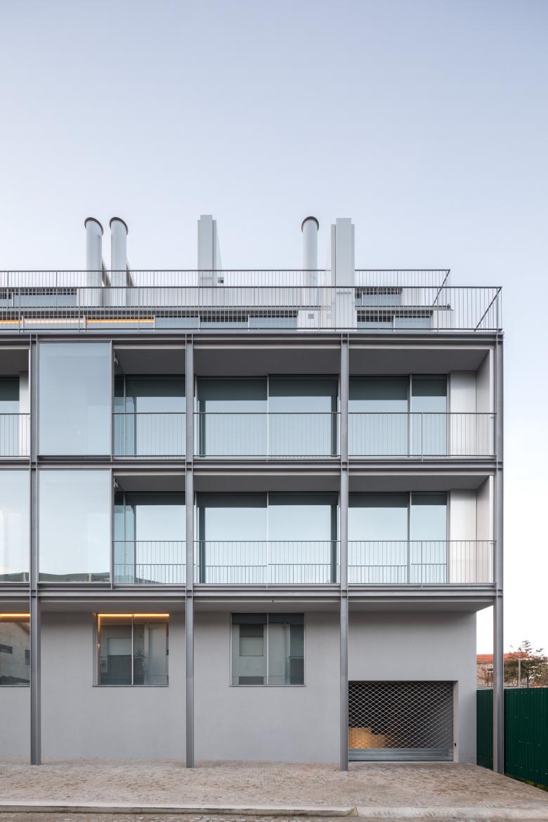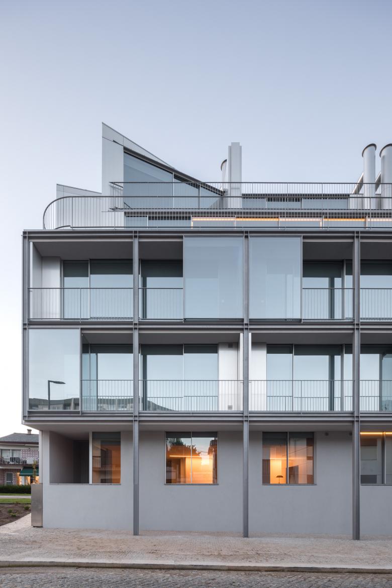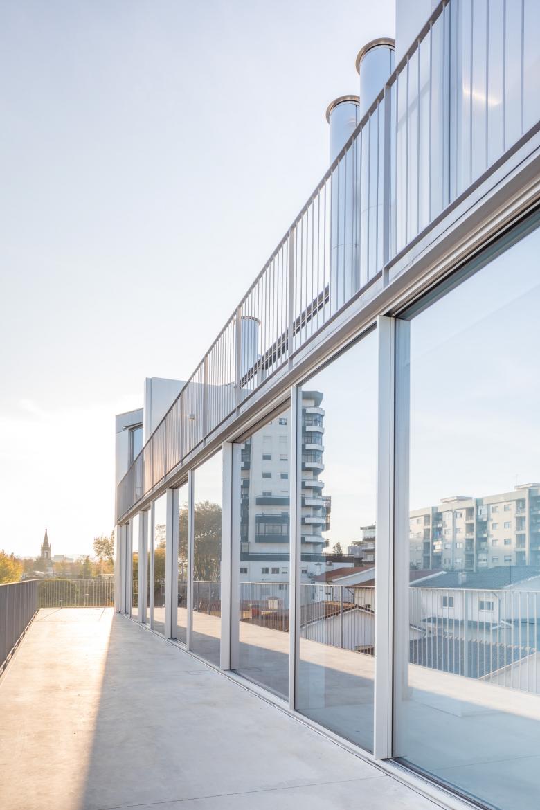 The building contains 16 units, 15 of which are residential. The ground floor includes two dwellings and one commercial space. Floors 1 and 2 share the same layout, each comprising five residential units. On floors 3 and 4, on the east side, the street façade is progressively set back to comply with the maximum height of three floors established for Rua Dr. Serafim Lima. This legal constraint allowed for the creation of large terraces for the larger housing typologies, organized as duplex units.