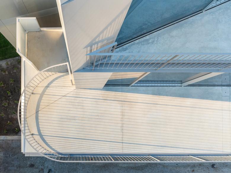 The internal structure is made of reinforced concrete, while the east and west façades are enclosed with low-profile aluminum frames fitted with solar-control glazing. The opaque vertical surfaces of the façade are clad with a ventilated system of brushed aluminum panels over a 10 cm layer of thermal insulation.