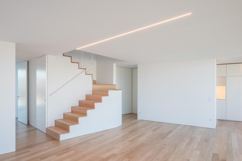 The flat roofs combine the concept of a conventional flat roof with that of an inverted roof system—an insulation layer protects the waterproofing membrane, eliminating ceiling condensation and increasing the durability of the waterproofing.