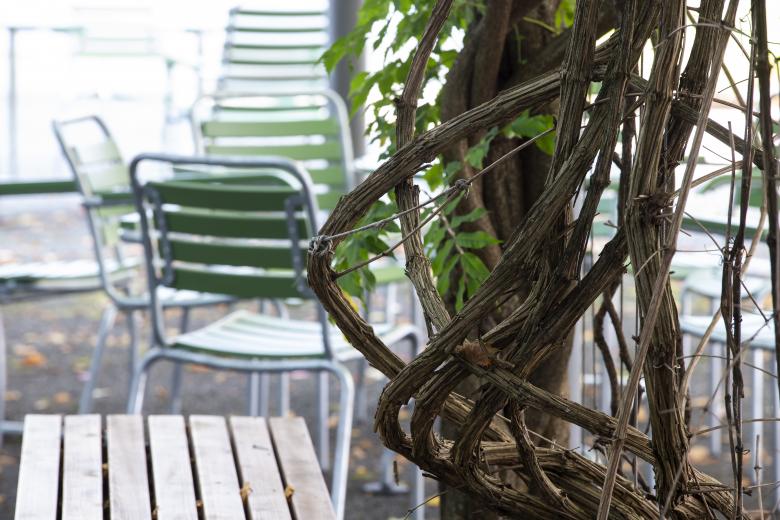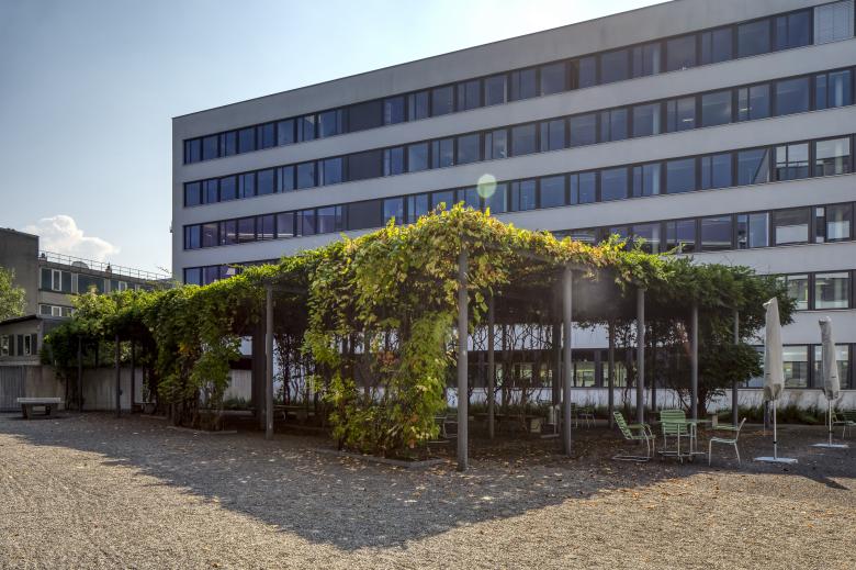 Mit dem Blick aus dem Fenster auf das Muster aus Seerosen, Belagsflächen, Grasstreifen und Gründach ist der Dialog von Künstlichkeit und Natur je nach Licht und Jahreszeit täglich neu zu entdecken. Erleben lässt er sich auf einer Ruhebank im Schatten des Blätterdaches, beim Spazieren den Gräsern entlang bis zum Seerosenbecken oder bei einer entspannten Partie Pétanque auf den Kiesflächen.
