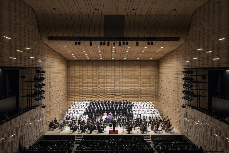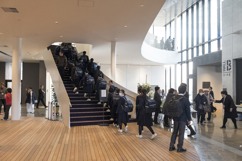 Comprised of Hall A (838 seats), Hall B (218 seats), a gallery, practice rooms, and other spaces, the civic hall has a number of distinctive features, including a People’s Plaza with a glass roof; a large performance hall finished in natural wood whose seats can be removed to create an open floor area; a smaller performance hall that faces and can be fully opened to the plaza; “pathways” leading through all areas of the building, without conventional divisions between public and behind-the-scenes spaces; and various retractable seating and large-scale cabinetry that can be rearranged so that the large and small halls, lobby, and citizen’s plaza form an 80-meter-long all-weather city plaza.