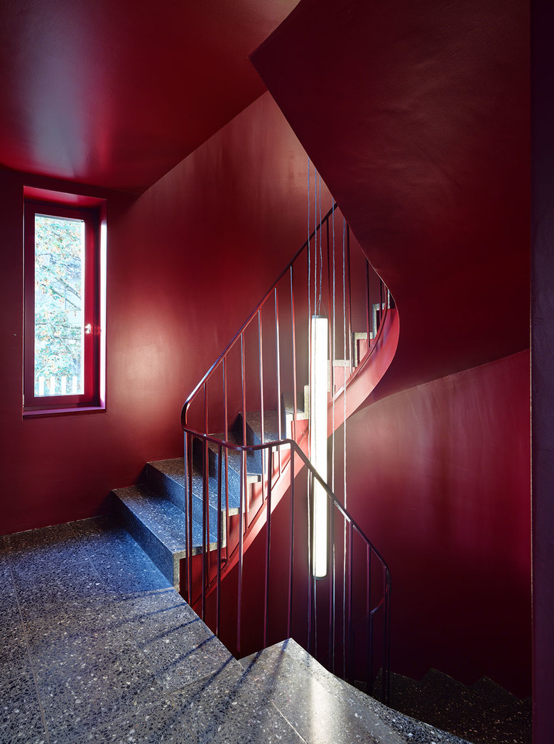 Die neuen auskragenden Balkone ergänzen die vorhandene Bänderung und verweisen zugleich mit den gerundeten Ecken auf den markanten Treppenturm. Durch den Rillenputz bleibt der monolithische Eindruck erhalten. Seine strukturierte Oberfläche erinnert an den mit vertikalen Latten geschalten Sichtbeton. Der Hauszugang ist neu gegenüber der Sonneggstrasse um ein halbes Geschoss tiefer gelegt. Damit wird ein Vorgarten möglich, der die notwendige Privatheit für das Wohnen im Erdgeschoss schafft.