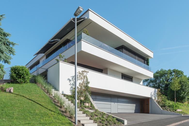 Two storey apartments with approximately 160 square meters each were the basic requirements for this apartment building. From the property lines, a building shape emerges, which bends apart like two clasps and in the middle of which stands a core that can be completely circled. As a result, the interior is broken open and special room sequences are formed. Due to the hillside location, the building can be accessed at ground level in the basement with an underground car park. A staircase opens both floors.