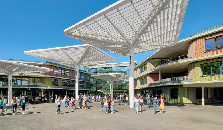 The look of the campus depends largely on the parasol structures, which from the park appear confidently in view, symbolically extending their protective roof over the school group. On the entrance side and on the street side, the lycée presents an orthogonal and rectilinear structure. The new parts of the building are adjacent to the existing building in the direction of the park and the school courtyard. Here, the school building is designed in a more free and open way. The curved wings of the building frame the school courtyard, from the middle of which the welcoming and protective parasols structures unfold. They create covered zones and mark the transition from the interior towards the exterior.