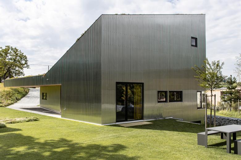 The entire construction of the house was made of a lightweight timber frame construction, combined with partially visible steel construction. The floor slab in contact with the ground is of solid concrete construction and also forms the finished, polished and waxed floor surface. It also serves as a storage mass element, balancing the light roof structure. The building climate is also regulated by the large green roof area, it serves as structural solar and thermal protection in the southwest, favored by its thick vegetation layer. The vertical façade is back-ventilated by an aluminum-natural corrugated metal façade suspended on a wooden structure.