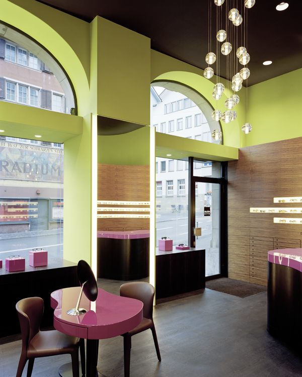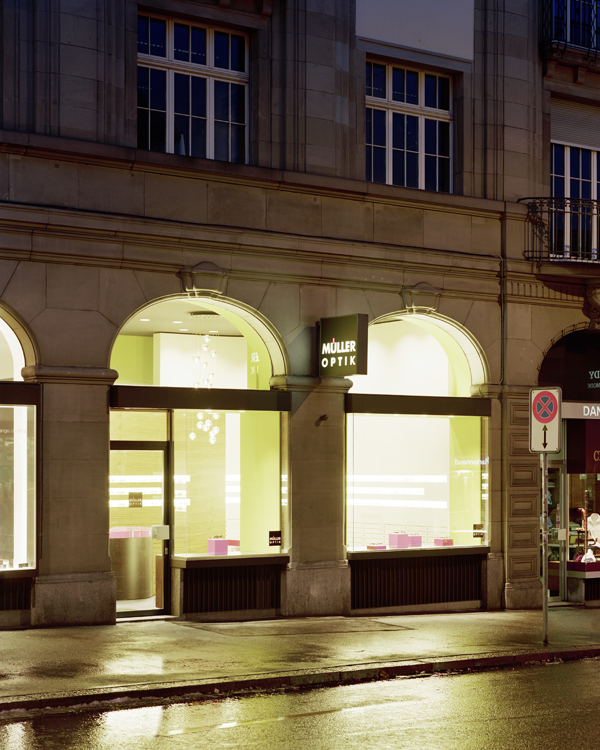 Müller optician’s store has a compact sales floor, so clever use of the available space was of the essence: two rounded walls are positioned in relation to each other to form the sales room and the examination room behind it, making the space feel larger than its dimensions would suggest. The striking surfaces feature natural tones and wood, creating an almost familial atmosphere with their warm medley of colours. The kidney-shaped sales counters provide a colour contrast. With their shiny pink finish, the counters seem to float like clouds in the atmospheric sales room.