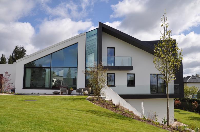 Die Bauherren folgten unserem Vorschlag und setzten das Konzept gemeinsam mit uns um. Die klare Linienführung, die translucente Qualität des Glases und die zentrale Achse verleihen dem Haus eine eigenständige Identität, die sich harmonisch in die Umgebung einfügt.