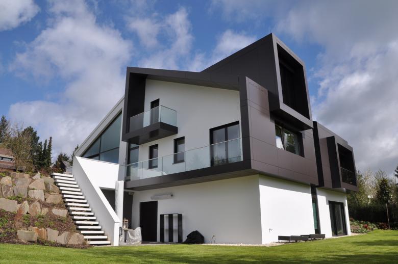Aus den baurechtlichen Vorgaben des Grundstücks mit der Vorgabe Satteldach entwickelten wir eine Fassadenidee, die über den Standard hinausgeht. Unser Ziel war es, die äußere Hülle gestalterisch wie konstruktiv zu optimieren. So entstand eine Fassade mit einer baulichen Glasfuge im Bereich der Firstlinie. Diese Glasfuge dient im Innenraum als Erschliessungsachse und trennt zugleich private von öffentlichen Bereichen, ohne das räumliche Motto zu entkoppeln.
