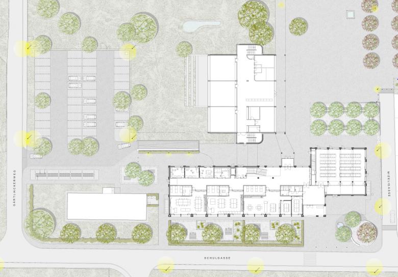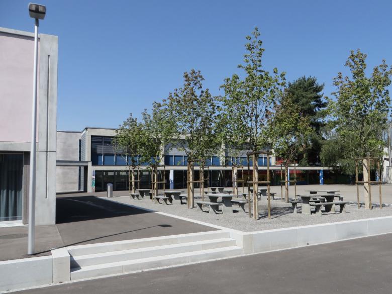 Der Freiraum zwischen den Parkfeldern und dem Neubau dient vornehmlich der Erschliessung der Schule. Auf der Höhe des Pavillons entsteht eine kleine platzartige Situation als Warteraum und Treffpunkt. Das Kiesfeld mit schattigem Baumdach und Sitzmöglichkeiten wird Teil des Pausenhofes und dient auch als Aufenthaltsbereich bei Dorfanlässen, welche auf dem Areal statt finden.