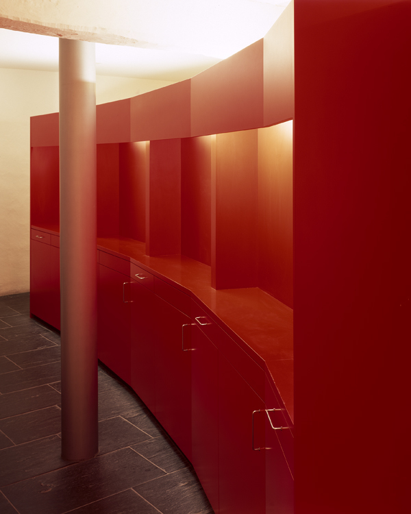 Dudli optician’s store is well established in the city of Wil. This is not just because its owner maintains good relations with the residents of Wil – the shop itself is part of the old city wall. The extraordinary thickness of the outer walls is a testament to this, and the deep window recesses make perfect showcases for the shop’s wares. Behind it is a square room with slate floors and a restored Renaissance ceiling. A sweeping wooden furniture component divides the space into two areas – one for consultations with customers and one for examinations – while also serving as a display case for the glasses.