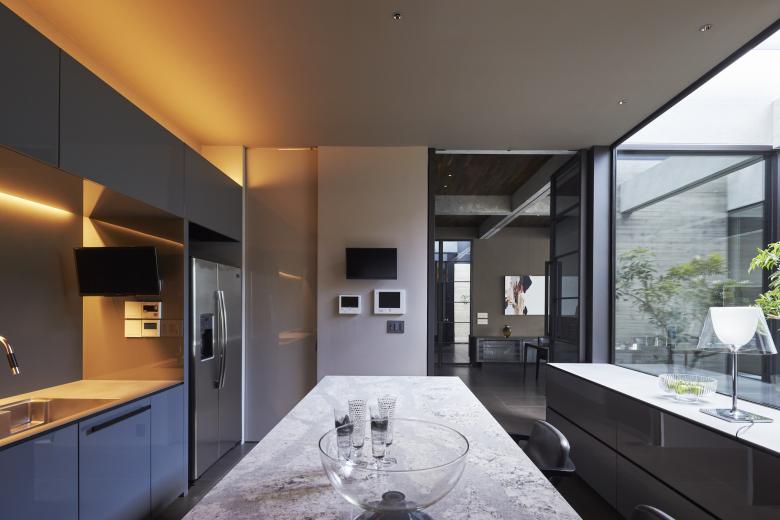 The clients purchased the tiered, irregularly shaped lot as a place to spend meaningful time as a family. They wanted courtyards to play a big part in their home life, and to fulfill that request, the design makes use of the distinctive property shape and topography.