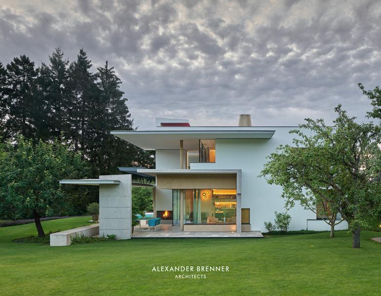 The living level is designed as an open-plan spatial continuum with predominantly floor-to-ceiling glazing facing south west over the landscape garden. The open hall leads to the dining and the kitchen area, which is adjoined by a terrace and a pool facing south-west and to the living area with its fireplace.