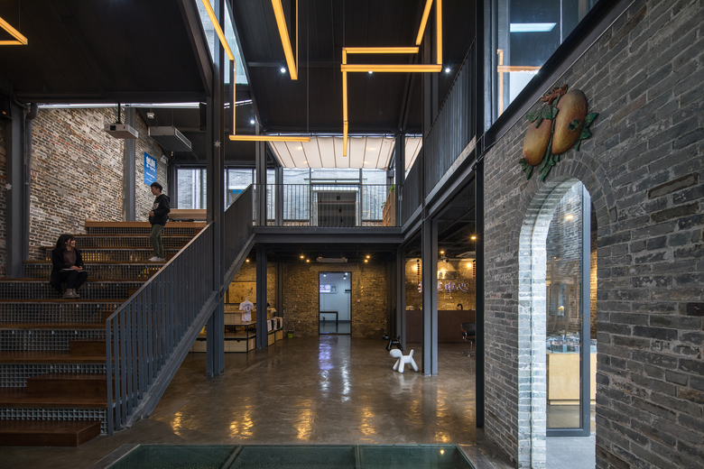 YUN: The building itself, built in the late Qing Dynasty, is the oldest architecture in the district. It is the main entrance of all office, reception and conference space. As the roof is collapsed seriously, while the wall is much better preserved, we chose to reserve the walls completely, to clean up and restore the texture of old brick walls. We insert new steel structure system and build a new roof system, forming a public space which old and new are at the same time separated and fused.
