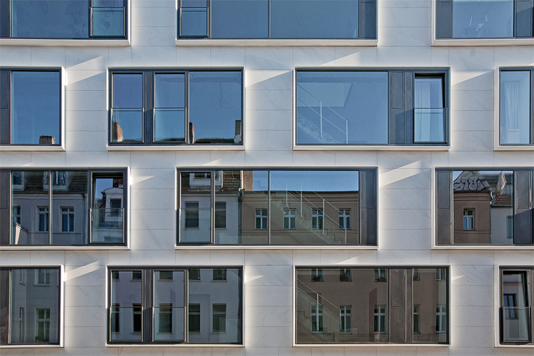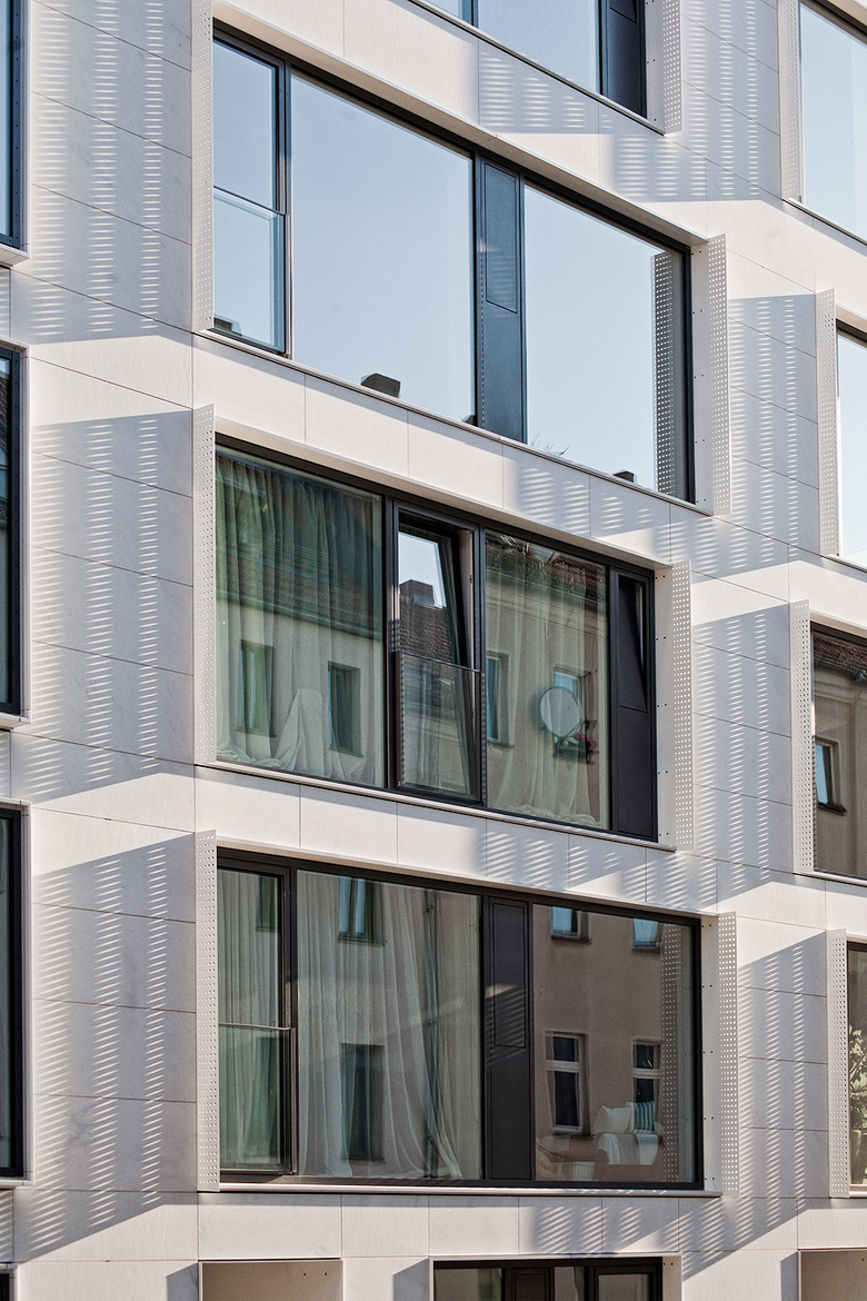 Large scale windows in staggered order differentiate the facade and give it vivid appearance. They blend well with the generous loggias that are so characteristic for the area.