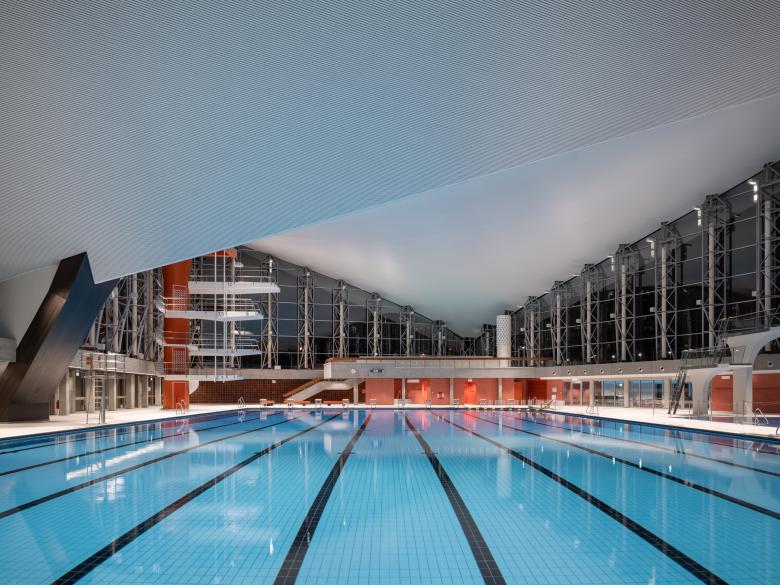 Das Gestaltungsziel war die Freiformdecke frei von Leuchten zu halten und die Fassadenkonstruktion nicht anzustrahlen, sodass der Raum auch von außen klar ablesbar wird, ohne dass visuell wirksame Überstrahlungen und Blendung entstehen. Das direkte Licht aus den Beleuchtungssystemen verlässt die Schwimmhallen nicht.