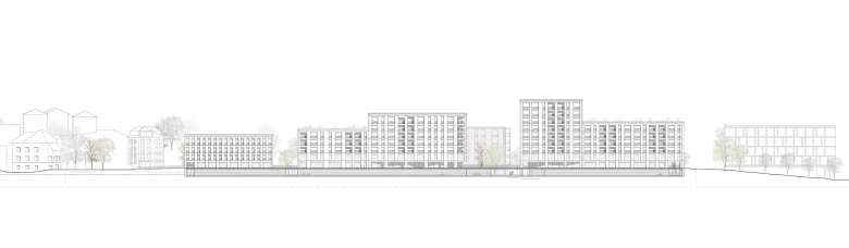 The new neighbourhood will provide space for various resident groups, ranging from students to families to the elderly. The cooperative building with a community room and children’s daycare centre is centrally positioned between the town square and the urban park. Along the main axis, businesses and stores in the ground-floor spaces will ensure liveliness and, together with a buvette (wine bar) on the public square, make a significant contribution to the identity of the quarter.
