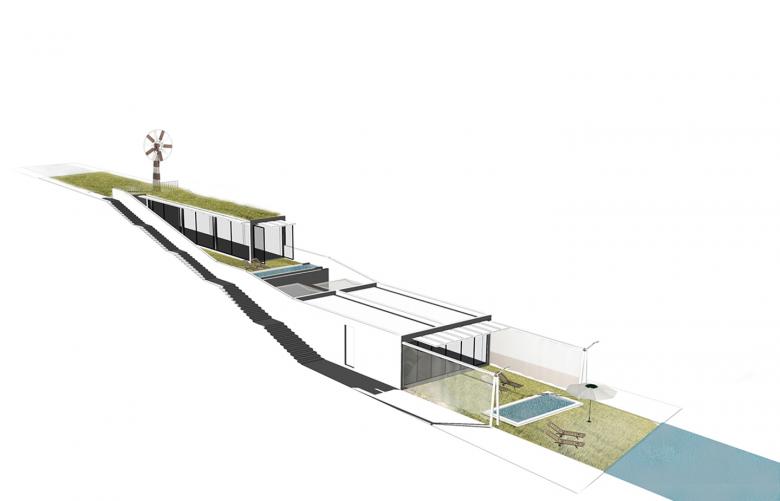 Lining the coast are twelve 96-square-meter suites. Units accommodate a reception space, two master suites, and an open courtyard. Three meters above, twelve 63-square-meter longitudinal suites are terraced into the depth of the slope. The 18-meter length and 3.5-meter width of the eastern and northern orientations are treated with retractable glass walls opening onto a wrapping garden.