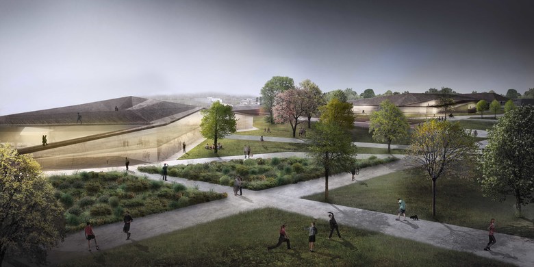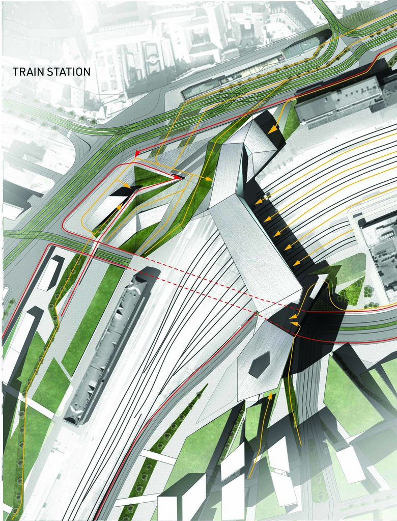 This sculptural railway station will be the new iconic gate of the city of Brno: its bridge development not only gathers the access to the new high speed line but also enhances the connection to the new neighborhood linking the plaza in front of Mala America and the old city with the site.