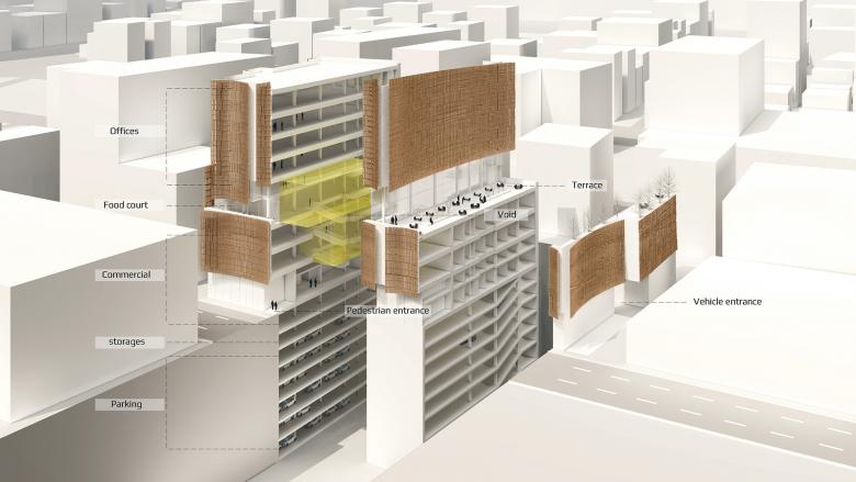 Far from the typical Podium/tower office retail typology, the project looks for an organic integrity between the parts, achieved through the big curved porous shells in terracotta covering the façade. These shells are obtained by alignment of the vertical full and void elements, that slide on each other top-down wise randomly. In such a way, the façade seems a handmade work (a quality favored by Habibeh Madjdabadi), and the shadows seem natural. The double façade (terracotta mesh and glass), has the function of protecting the building against the sun radiations during the hot seasons, while assuring full view over the surroundings.