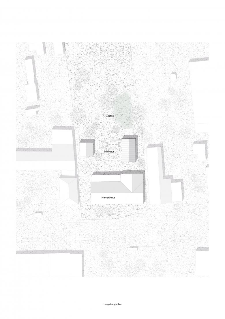 Mitten im Hinterhof auf einem Grundstück in der Dorfkernzone Neunkirch entsteht ein kleiner Hofbau als Altersresidenz. Der bewusste Entscheid der Bauherrin, vom belebten Herrenhaus in dessen Hinterhof zu ziehen, ermöglicht die Umnutzung eines einstigen Gartenschuppen zu einem kleinen Wohnhaus für den fortgeschrittenen Lebensabschnitt. Im grossräumigen Stadtrandhaus wird so Platz für neue Familien geschaffen. Ein regenerativer Kreislauf der Wohnform verschiedener Generationen entsteht. Das, durch den Umbau neu gewonnene, bewohnbare Bauvolumen leistet einen wichtigen Beitrag zur Verdichtung im Bestand. Die sumpfige Senke im Norden des Hofbaus wird zum selbstreinigenden Schwimmteich erweitert. Es entsteht eine Gartenanlage, die den Bewohnern des transformierten Hofbaus gleichermassen wie denjenigen des Herrenhauses zu Verfügung steht.