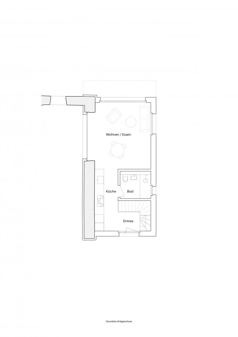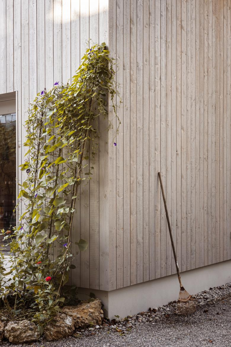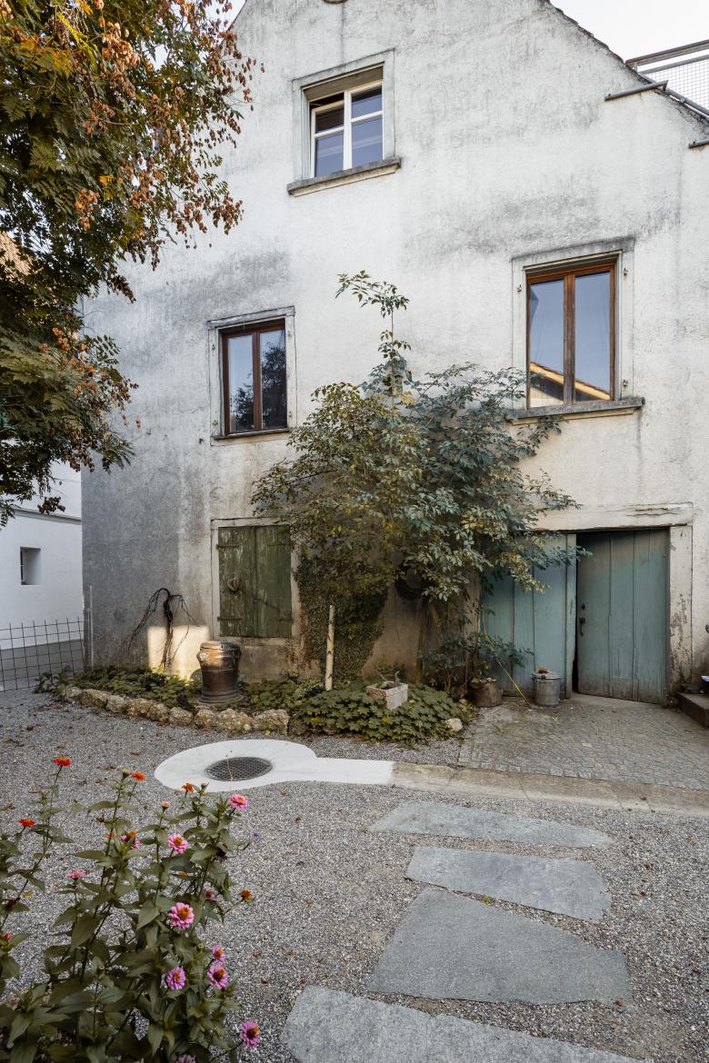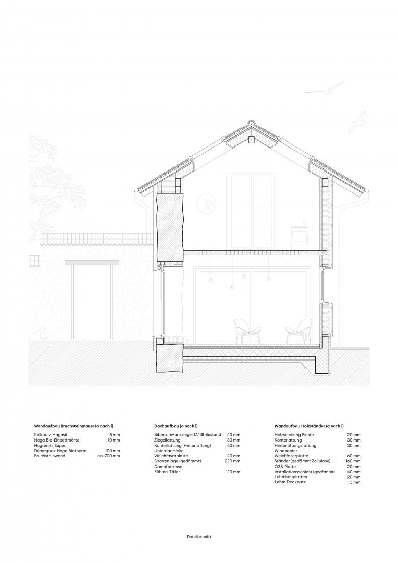 Das Gebäude schmiegt sich harmonisch an die bestehende Bruchsteinwand und implementiert sie in die Tragstruktur. Ein vernakulärer Charakter entsteht über die gesamte Gebäudelänge. Die Gliederung der Nutzung in private Räumlichkeiten im Obergeschoss und öffentliche Räume im Erdgeschoss lässt sich klar erkennen. Fürs Alter entwickelte Raumabfolgen bieten mannigfaltige Nutzungen bis hin zur reduzierten Wohnform als ebenerdiges, eingeschossiges Studio. Kontemporär und langlebig soll die Umnutzung sein - so der Wunsch der Bauherrin. Entsprechend agiert der Hofbau für künftige Generationen auch als Single oder Paar-Haus. Die minimale Fläche soll sinnbildlich die Frage nach der Genügsamkeit an materiellen Werten aufwerfen.