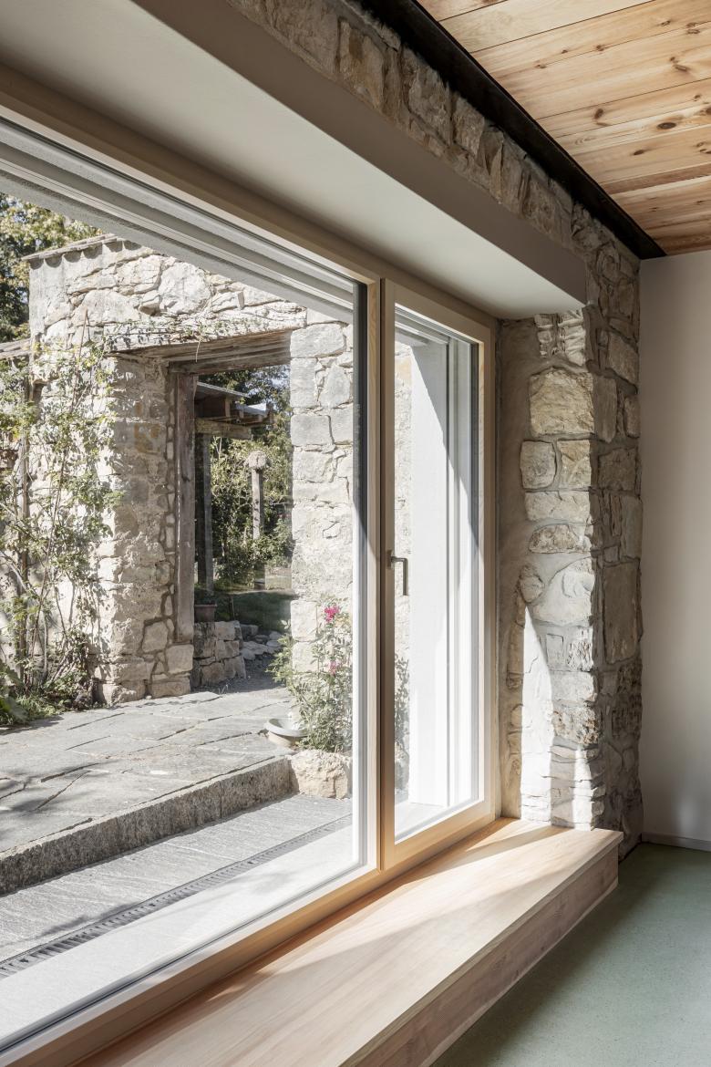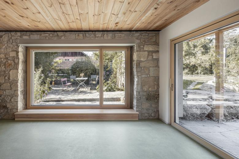 Das bestehende Natursteinmauerwerk bildet die Tragkonstruktion für die quer gespannte Holzbalkendecke sowie Auflager für die Dachkonstruktion. Durch den monolithischen Deckenaufbau über dem Erdgeschoss (ehemalige Dachsparren, Föhre) wird der CO2 Verbrauch auf ein Minimum reduziert und im Werkstoff Holz gespeichert. Das Obergeschoss, welches ohne Fussbodenheizung ausgerüstet ist, wird passiv vom darunterliegenden Geschoss mitbeheizt und temperiert. So sind die Temperaturzonen optimal an die differenzierten Nutzungen und die Bedürfnisse der Bewohnenden angepasst. Die Energie fürs Heizen kommt über die zentrale Schnitzelheizung im Herrenhaus.