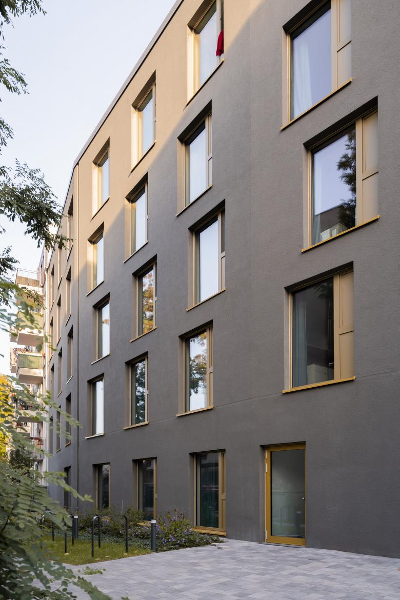 Das Gebäude komplettiert als Schlussstein die vorhandene Blockbebauung. Seine Gestaltung ist durch die optische Gleichbehandlung von Wand- und Schrägdachflächen gekennzeichnet, die das Gebäude monolithisch wirken lassen. Gleichzeitig teilt die Farbgebung es in zwei Gebäudeteile, ein Spiel mit Volumen und Oberflächen, mit der Maßstäblichkeit und Körnung der Umgebung. Die leichte horizontale Verschiebung der Fensterreihen verleiht der Fassade eine spielerische Dynamik und vermittelt gleichzeitig Leichtigkeit und Individualität. Die zur Bewegungs- und Kommunikationszone orientierten Wohn-Küchen der Apartments und Wohngemeinschaften bieten den Bewohner*innen ein hohes Maß an Aufenthaltsqualität. Gemeinschaftsbereiche schaffen eine Atmosphäre der Offenheit und fördern den sozialen Austausch. Die Wohnungen sind kompakt, schaffen aber durch die großen Fensterelemente und viel Tageslicht Großzügigkeit.