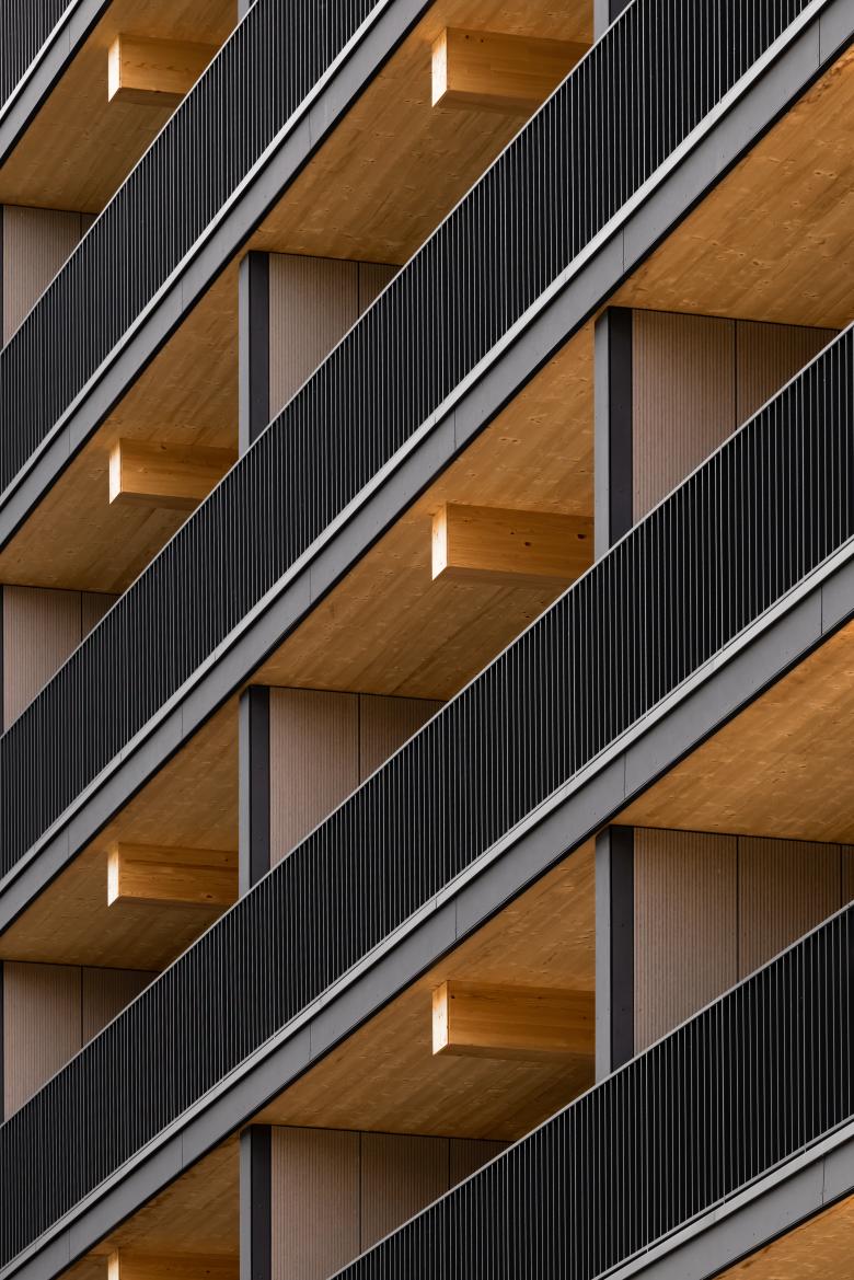 The ecological impact extends beyond the building, which is surrounded by a green, park-like garden designed by LAP Landscape & Urban Design. West facing balconies provide broad views and a strong connection to nature. The design also includes biodiversity features such as bird and bat nest boxes integrated into the façade.