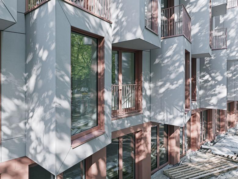 Rieder hat es sich zur Aufgabe gemacht, die Welt des Betons auf ganz andere Art und Weise erlebbar und einsetzbar zu machen. Mit den filigranen Betonlösungen für die Gebäudehülle steht der sonst so schwerfällige Werkstoff für vielerlei Anwendungsformen zur Verfügung. Frei gestaltbar in Form, Farbe, Oberfläche, Textur und Format ermöglichen die Elemente die Umsetzung unzähliger Designs und eröffnen Planenden neue Möglichkeiten im Umgang mit Beton. Nicht nur bei diesem Projekt in München lebt die Gebäudehülle durch die geschickte Kombination von unterschiedlichen Materialien. Kupferfarbenes Metall und raue concrete skin Elemente erweisen sich bei „Van B“ als unschlagbares Team in der Fassadengestaltung. Gerade der Mix aus verschiedenen Nuancen und Strukturen hebt das Fassadenprodukt aus Glasfaserbeton – hier in der Farbe ivory – speziell hervor. Durch die asymmetrischen Vorsprünge wird das besondere Erscheinungsbild der Außenhaut noch verstärkt. Das Drinnen und Draußen verschwimmt fließend. „Bei „Van B“ haben wir dieses Konzept mit den zahlreichen Fenstern, den Balkonen und vor allen Dingen den „Bay Windows“, die den Innenraum erweitern und die Wohnungen in die Bäume hineinragen lassen, umgesetzt“, erklärt Ben van Berkel.