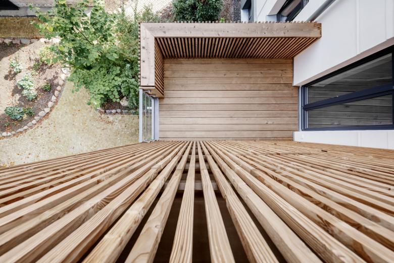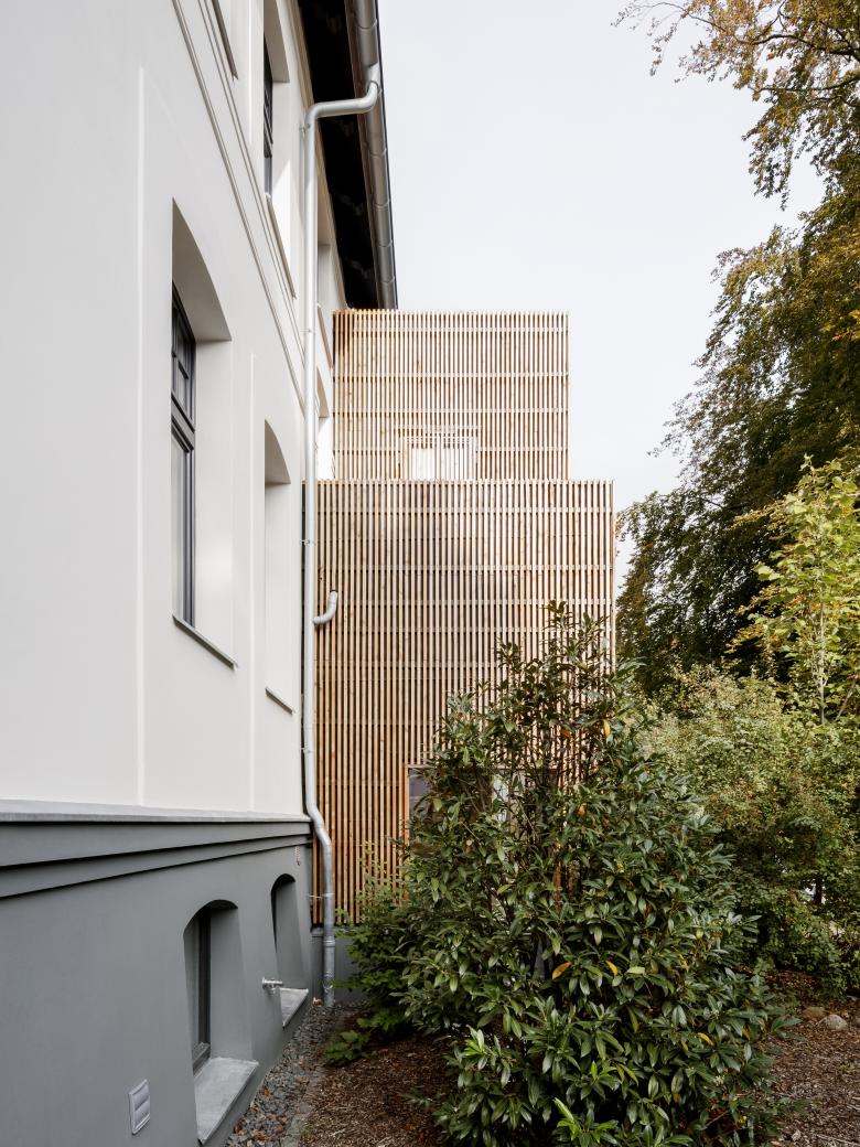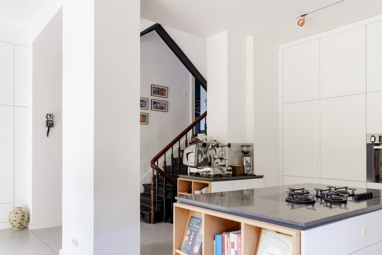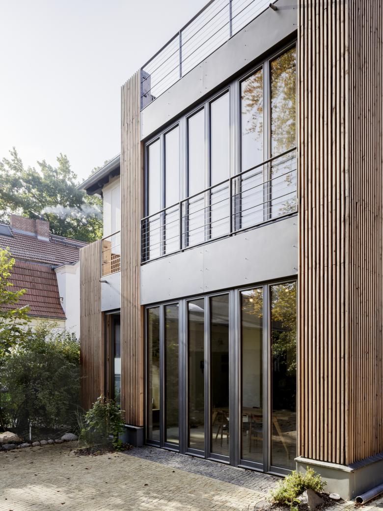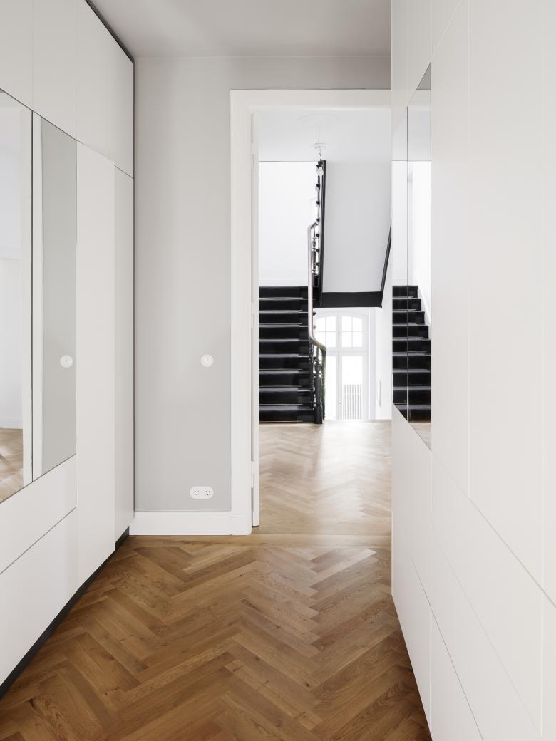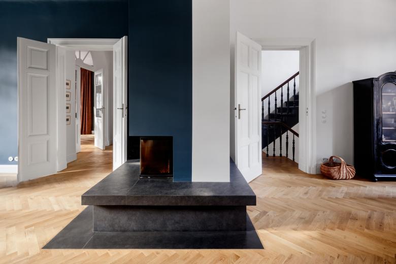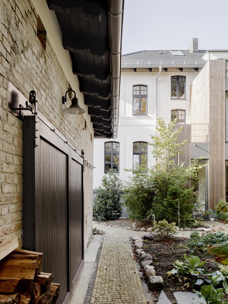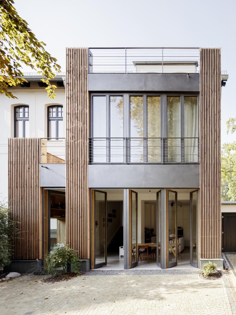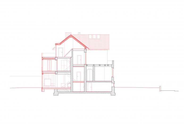 Für eine vierköpfige Familie haben wir die Vorstadt-Villa aus dem Jahr 1890 umfassend saniert und umgebaut. Die Familie wünschte sich einerseits den Charm der Altberliner Villa, mit ihren Holzböden, hohen Räumen und Türen, andererseits bestand ebenso der Wunsch nach einem modernen, lichten Raum für das gemeinsame Kochen und Essen. Der baufällige, in späteren Jahren hinzugefügte Anbau des Hauses wurde abgetragen und durch eine moderne Erweiterung ersetzt, welche in der Gartenetage die grosse Wohnküche und in der darüber liegenden Etage das Eltenschlafzimmer beherbergt. Alle Etagen im Haus wurden modernisiert und die Grundrisse teilweise umgestaltet. Der alte Dachstuhl, welcher mit giftigem Holzschutzmittel behandelt war, wurde abgetragen und durch einen neuen ersetzt. Das Dach wurde dabei etwas angehoben, um auch im Dachgeschoß Aufenthaltsqualität zu erhalten.