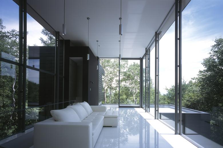 This vacation home was planned in a resort community which is located at a height of 1,700 meters above sea level at the foot of Yatsugatake. The site slopes gradually towards the east-southeast and the surrounding area is covered with white birches and bamboo, leaving strong impression of the thick woods. The site has been subdivided at a plentiful space that gave us an excellent surrounding natural environment to realize the project. The building is designed with a number of box shapes that are variously layered or staggered following the slope towards the rear of the site. The volume of each box shape contains independent functions, with each space being composed with different characteristics, such as the volume for the entrance, living, dining and kitchen area, and the sanitary space. When you step inside the entrance, which is designed as a closed box, you will automatically find the volume for the living, dining and kitchen area because of the height difference of these box volumes. Visitor’s eye level is sequentially led towards to the back of the volumes where there is a widespread open living space with a height of 4 meters. The trees are the only thing in your eyes there. Despite this building’s openness, we made it possible for the client to use the villa throughout the year by taking a full advantage of the great environment and also providing facilities and performance capable of withstanding the harsh climate at a height of 1,700 meters above sea level. We designed this villa to lead the scenery of fresh green leaves as well as the white snow into the living room.