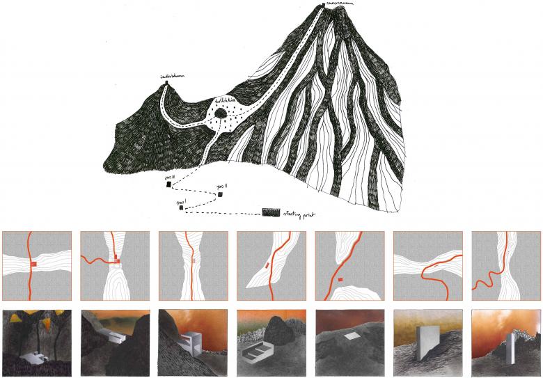 The city of Pompeii with its remains have lived through centuries as part of the western history. The landmarks created by volcanic eruptions can be considered as cultural phenomena. Remnants are not designable, yet the substance that we want to keep for the future man can be conceptualized by imagining the destruction of different materials due to their characteristics. This project illustrates thoughts about culture, remembrance and nature through stations of a ritual hiking tour on an active volcano. The architectural character is a result of a careful attitude to the remains of colonialism and reverence to the local traditional environment. Staying neutral in terms of forms, yet using symbolic and physical elements of the Javanese and Hindu culture was a principal part of the design process. Visiting an active volcano is a spiritual journey. The architectural forms accompany us on the road and support our inner approach. Process is a principal motive in the concept: the loss of functionality, the transformation of forms, the observation of natural forces, and the matter of the remains. All these phenomena attempt to show the distance that man has created between him and nature. The first base that takes place at the last inhabited area embodies the “west”, as the secure and civilized environment. However, the following sites are less and less adequate from this perspective, but increasingly more symbolic in terms of tradition and myth. Through the way the architectural forms deplete to a skeletonized monolith stone. At the final site architecture is irrelevant, because the natural force of the volcano is incomparably stronger than anything else. The architectural purpose disappears and sculptures come into place that change its iron forms within a dialog with the volcano’s hot lava, pyroclastic flow and steam. These ephemeral time and space dimensions here represent the mythology that’s rooted in the instinctive relationship of human and nature. Some materials will survive and stay as memorials, yet some disappear or alter by time. The remain becomes the final creation of the entire discussion.