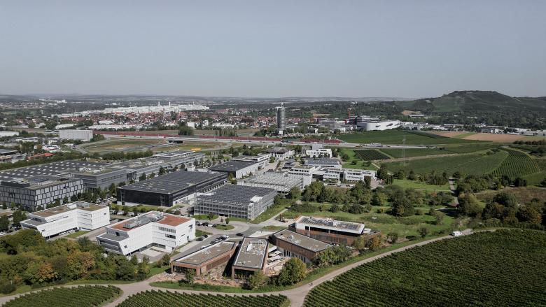 The urban location of the building site could not be more challenging: a beautiful scenery characterised by vineyards on one side and an efficiency-driven commercial architectural landscape on the other. Aware of these surroundings, the new office building for the Neckarsulm-based IT company bridges the gap between nature and industry, subtly creating a harmonious transition between these two extremes: With four fingers extending from a central foyer facing the industrial area far into the vineyards, the building interlocks with the surrounding natural space. At the same time, a multitude of natural open spaces are spanned between the individual wings and at the edges of the site: Trees, bushes and native plants settle on the slopes gently rising towards the vineyards and line the terraces. The roofs are also greened and equipped with a photovoltaic system.