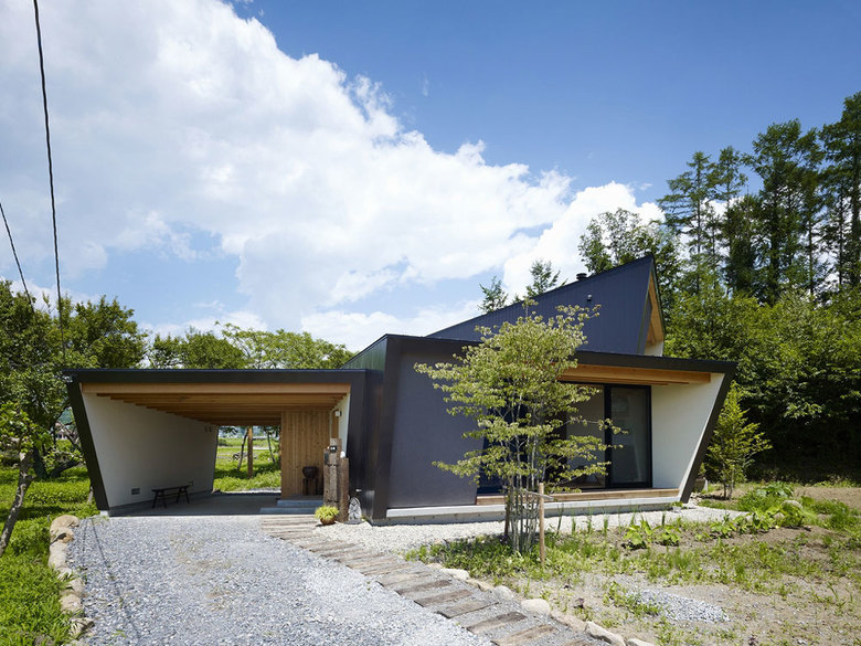 Situated in the foothills of Mt. Yatsugatake, this vacation home gently incorporates the natural environment around it. The fan-shaped design opening to the south means plenty of sun streams in during the cold winters: no matter the time of day there’s always a place to bask in the sun. In contrast, strong summer sunshine is blocked by a roof and side walls that protrude beyond the façade, providing shade. Windows in the north and south exterior walls bring cool breezes into the house. The result of these design strategies is a structure that is simple yet filled with a rich diversity of scenes.