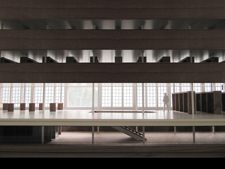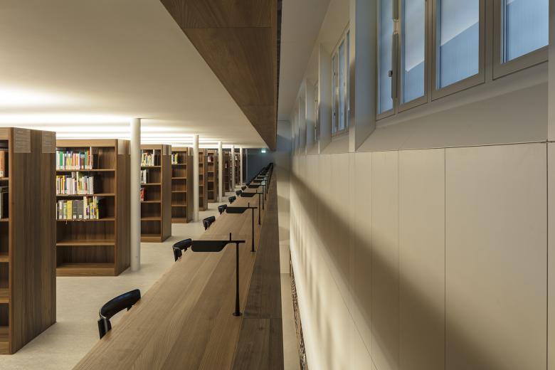 Der Schnitt des Gebäudes ist so angelegt, dass der Besucher beim Eintreten in den Raum die volle Höhe des Gebäudes spürt. Über Oberlichter entlang der Ostfassade gelangt Tageslicht bis ins Erdgeschoss. Die Lese- und Arbeitsplätze befinden sich entlang dieser neuen Galerien. Das Erdgeschoss wird durch eine zusätzliche, neue Treppe mit dem Untergeschoss verbunden. Ein Lichtschlitz entlang der Westfassade belichtet die Arbeitsräume und die Ausstellung der Sondersammlung. So entsteht ein offener, kontinuierlicher Raum im umgebauten Gebäude, und alle Geschosse werden räumlich miteinander verbunden. Durch die Offenheit wirkt die Freihandbibliothek hell und freundlich, ganz im Sinne des modernen Postulates von Sonne, Licht und Luft.