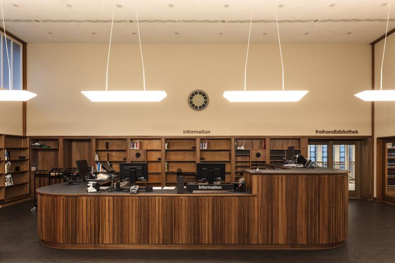 Die Materialisierung der Freihandbibliothek orientiert sich an den ursprünglichen Raumvorstellungen. Die Westfassade wird denkmalpflegerisch restauriert. Nur ein grosses Fenster weist zur Hirschmattstrasse auf die veränderte Nutzung hin.