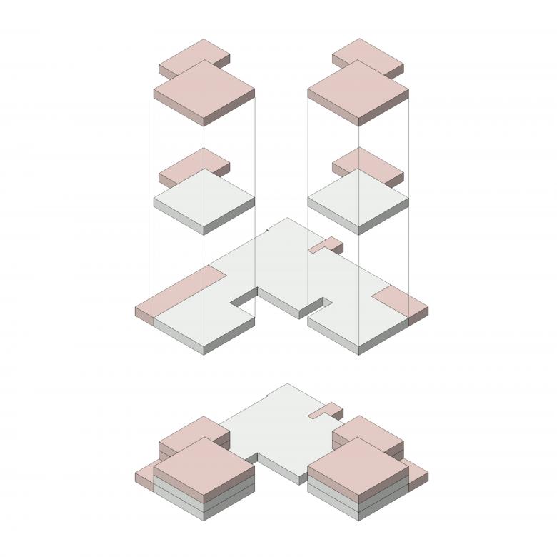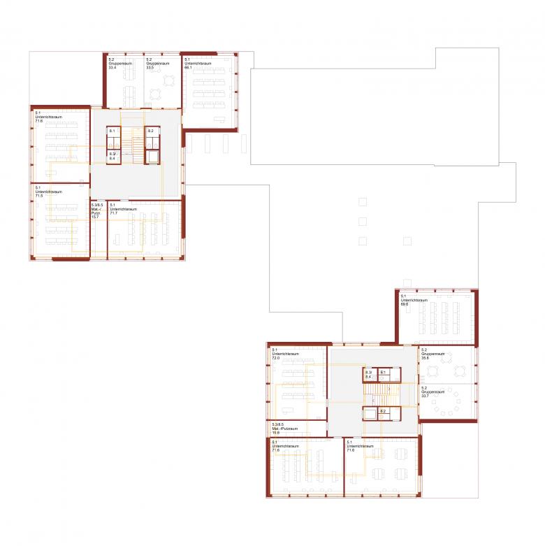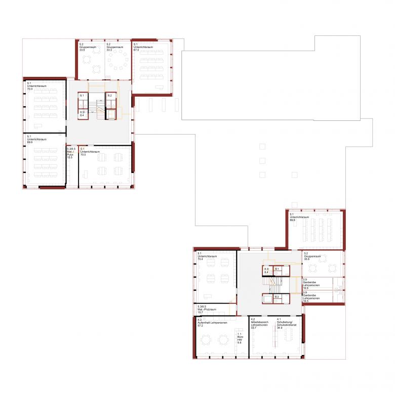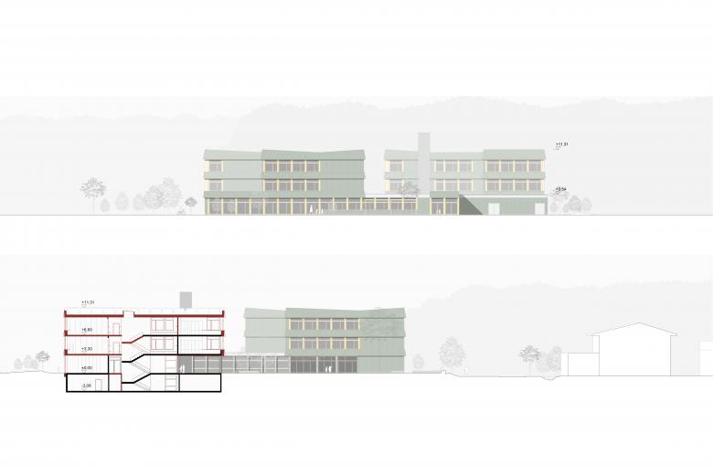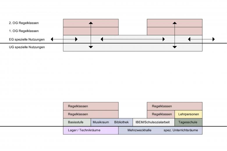Die beiden bestehenden Trakte werden erweitert und aufgestockt und so das gesamte Programm kompakt untergebracht. Die prägende Gliederung der Bauten und die Grosszügigkeit des Freiraums bleiben erhalten. Aufbauend auf der bestehenden Erschliessungsfigur sind die Regelklassen in den Obergeschossen beider Trakte untergebracht. Pro Geschoss werden neu vier Klassenzimmer und die dazugehörige Infrastruktur organisiert. Das Geschoss eines Traktes bildet die kleinste, überschaubare Einheit.