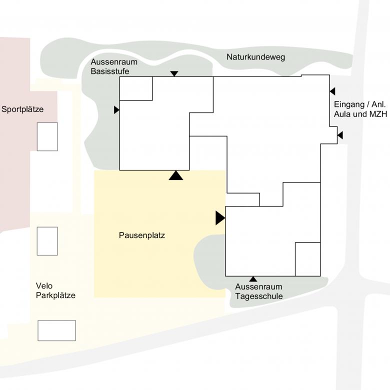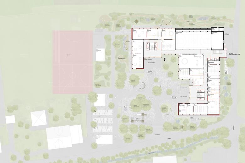 Das Erdgeschoss verbindet beide Trakte und beinhaltet alle weiteren Nutzungen. Die Tagesschule und die Basisstufe, am Fuss beider Trakte, verfügen je über einen direkten Zugang nach aussen. Die Neugestaltung des Nordzuganges schafft einen klaren Bereich für die mitunter auch öffentlich genutzte Aula und Mehrzweckhalle.