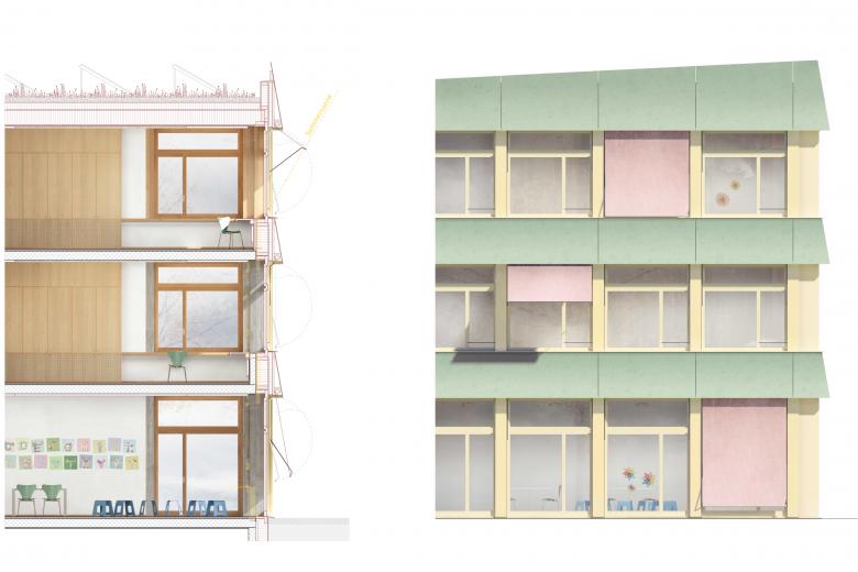 Das Gebäude erhält ein neues Kleid. Vorfabrizierte Holzelemente werden vor die Rohbaustruktur montiert. Die neuen Fenster sind im vorderen Bereich der bestehenden Betonstützen angebracht und die neue Dämmebene ist durchgehend aussen geführt. Mit Faserzementplatten wird die Geschichte des Gebäudes weitergeschrieben. Die Leichtigkeit des Materials wird mit der Neigung der horizontalen Bänder inszeniert. Gleichzeitig hilft diese Bewegung, den Sonnenschutz aufzunehmen und leistet Witterungsschutz für die Lüftungs-Oberlichter der Unterrichtsräume.