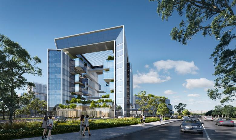 At the east end of the campus, an iconic, window-shaped building features flexible research, office and exhibition spaces on either side, framing the views beyond. A series of cascading gardens within the building’s frame create a lush green oasis. The ‘window’ building is completed at the top by large-scale executive meeting rooms and exhibition spaces which provide views out across the campus and the Songshan Lake district. This new gateway to the campus will provide improved access to Dongguan and become a new landmark in the city.