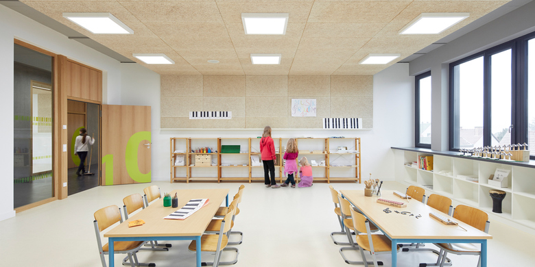 Zurück zum Eingang führt die Haupttreppe direkt nach oben zur Verwaltung mit dem Sekretariat. Geleitet durch „grüne Zungen“, wie die a|sh Architekten die Deckensegel nennen, die in die Flure hineinragen, wird der Besucher vom Flur aus zu den Funktions- und Aufenthaltsbereichen wie Garderobe und Frühstücksplatz geleitet. Die Flure werden so zu Differenzierungsräumen, die zusammen mit Clustern und Klassen den Lernbereich bilden. Hier können sich die Kinder innerhalb der freien Arbeit ihren individuellen Lernraum aussuchen.
