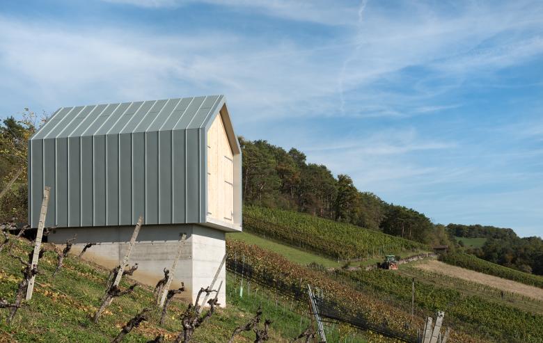 Das Rebhaus ist schon von Weitem gut zu sehen. Es thront auf einem zwei Meter hohen Betonsockel und erinnert mit seiner schlichten, symmetrischen Architektur an einen Sakralbau. Die Vorder- und die Rückseite des Gebäudes sind identisch, beide verfügen über ein raumhohes, fünfeckiges Tor aus Tannenholz. Rückseitig erfolgt der Zugang ins Gebäude, vorne eröffnet sich ein fantastischer Ausblick auf das Dorf Bözen und die umgebende Hügellandschaft.