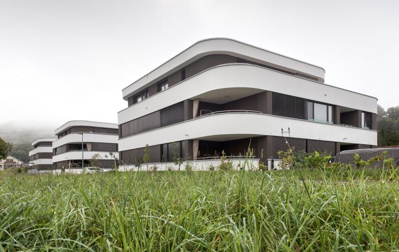 Am nördlichen Rand der Gemeinde Kaisten wurde die Überbauung «Triangolo» bestehend aus drei Mehrfamilienhäusern mit insgesamt 21 Eigentumswohnungen realisiert. Die Häuser wurden in grosszügigem Abstand auf einer Linie zueinander angeordnet. Sie fügen sich so unaufgeregt in das bestehende Einfamilienhaus-Quartier, setzen mit ihren geschwungenen Formen aber auch neue, faszinierende Akzente. Die Schwünge lassen die Baukörper leicht und elegant wirken, obschon diese ein stattliches Volumen haben. Sie umfassen auf drei Etagen jeweils sieben Wohnungen.